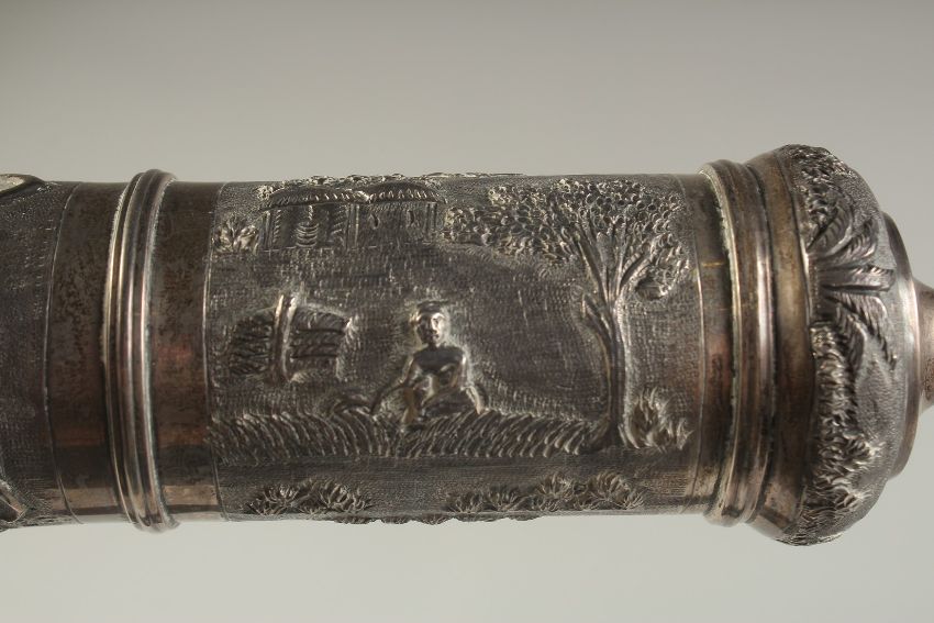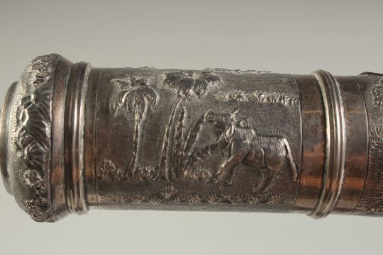 A LATE 19TH -EARLY 20TH CENTURY INDIAN SILVER SCROLL HOLDER, of cylindrical form with vacant cartouche and embossed with figures, animals and huts, upon a shaped ebonised stand with silver supports and silver panel of India, 42cm long.