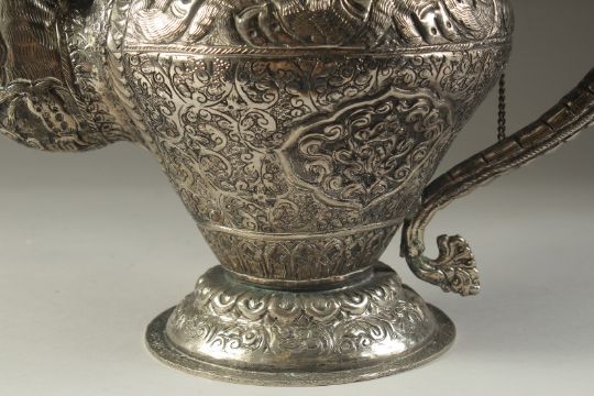 A LARGE CHINESE EMBOSSED AND ENGRAVED WHITE METAL LIDDED JUG, possibly low grade silver, decorated all over with various motifs and auspicious symbols, with dragon formed handle and elephant spout, 40cm high.