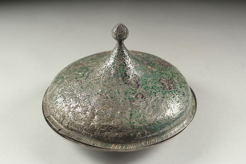AN EARLY - MID 19TH CENTURY NORTH INDIAN MUGHAL ENAMELLED SILVER LIDDED DISH, possibly Lucknow, dish signed and dated, 21.5cm diameter.