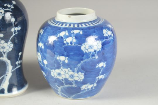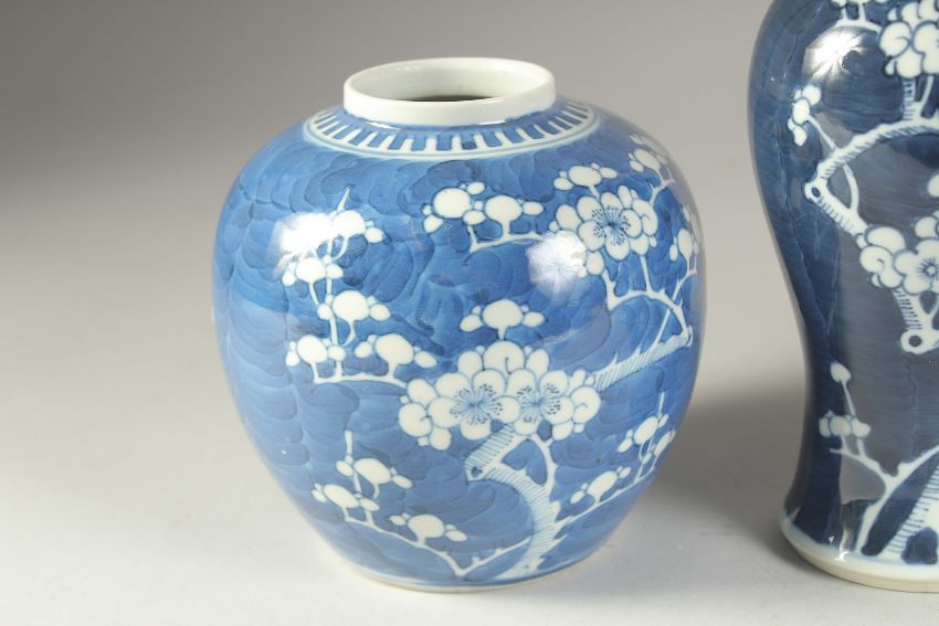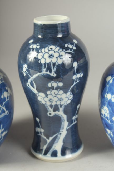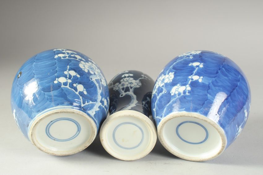 A PAIR OF 19TH CENTURY CHINESE BLUE AND WHITE PRUNUS JARS, together with similar vase, (3).