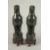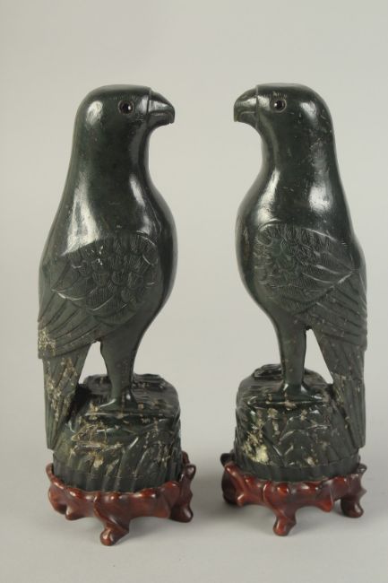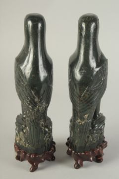 A PAIR OF CHINESE CARVED DARK GREEN HARDSTONE BIRDS, mounted to fitted carved hardwood stands raised on four feet, 26cm high.