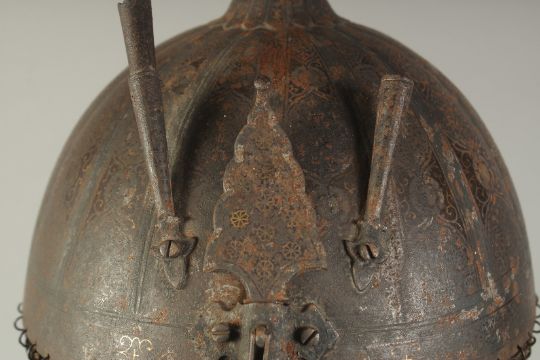 A PERSIAN QAJAR GOLD INLAID STEEL HELMET, with retractable nose guard flanked by two plume holders, the back with chain mail skirt, helmet 23cm x 19cm.