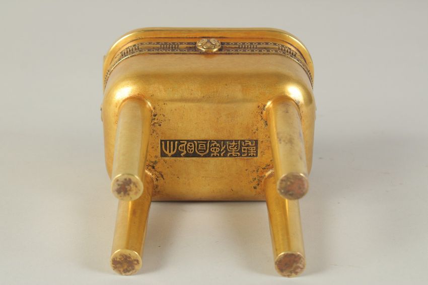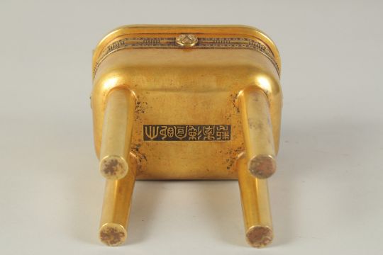 A CHINESE HEAVY GILDED BRONZE TWIN HANDLE CENSER, raised on four tall legs, the base with character mark, 19.5cm high (including handles).