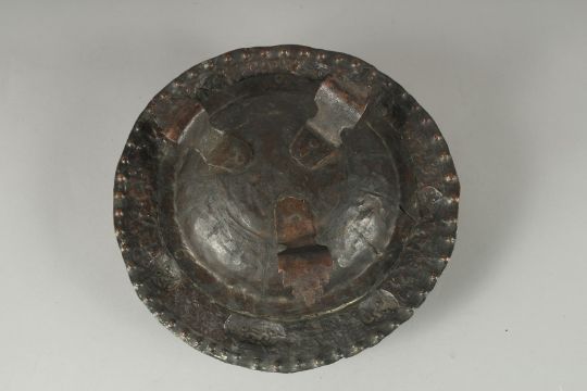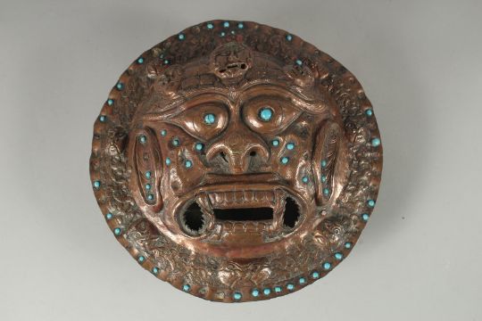A 19TH CENTURY TIBETAN COPPER INCENSE BURNER WALL MASK, inset with turquoise beads, 24cm diameter.
