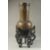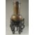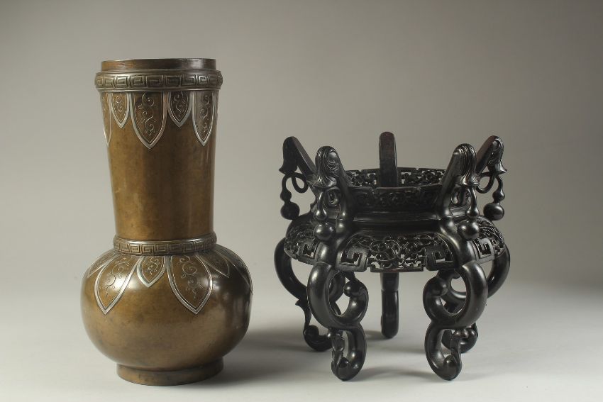 A FINE JAPANESE MEIJI SILVER INLAID BRONZE VASE, on a carved and pierced hardwood stand, with two bands of decorative foliate lappets to the rim and shoulder, inscribed to the base, vase 29.5cm high.