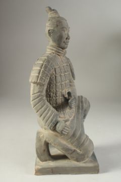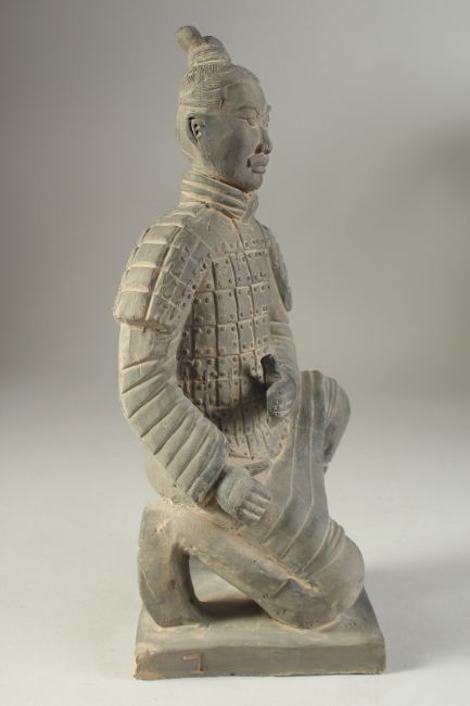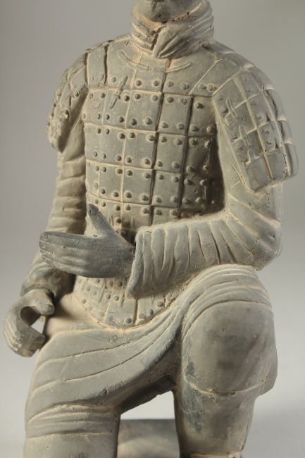 AN ANTIQUE POTTERY TERRACOTTA ARMY WARRIOR REPLICA FIGURE, 34cm high.