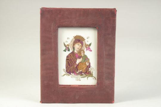 A PORCELAIN PANEL DEPICTING MADONNA AND CHILD, with gilded highlights, in fabric overlaid wooden frame, 35cm x 27.5cm overall.