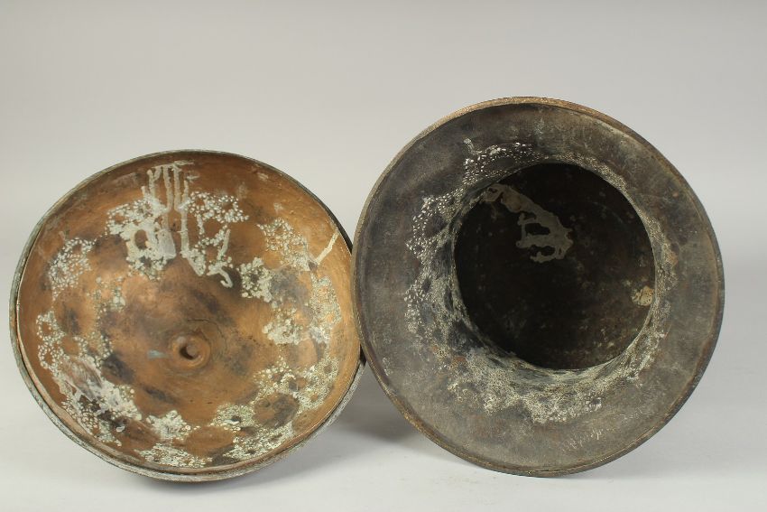 A FINE LARGE 19TH CENTURY PERSIAN QAJAR ENGRAVED AND OPENWORKED BRASS LIDDED VASE, 53cm high.
