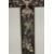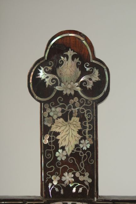 AN 18TH-19TH CENTURY CHINESE MOTHER OF PEARL INLAID EBONY CROSS, with fine foliate decoration and the base with a vase of flowers on a stand, reverse with hanging peg, 45cm x 25cm.