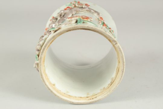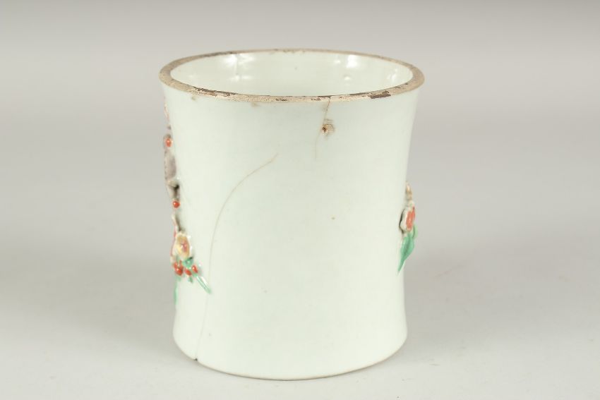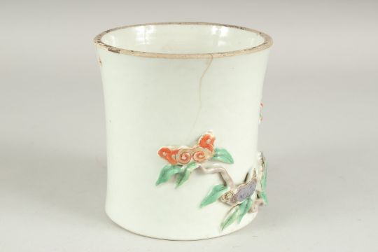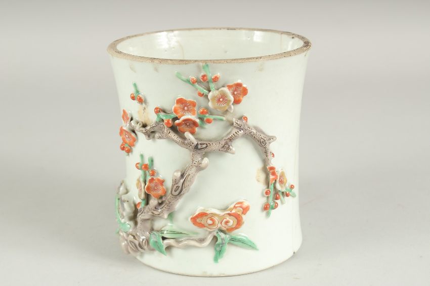 A CHINESE PORCELAIN RELIEF DECORATED SLEEVE SECTION - POSSIBLY FROM A VASE, the moulded relief decoration in the form of prunus blossom and ruyi, 13.5cm high, (faults).