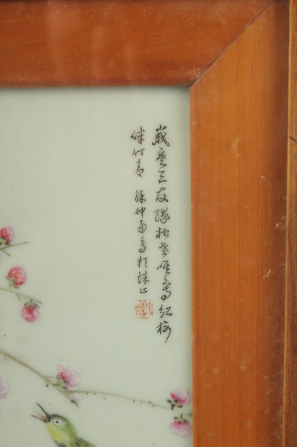 A CHINESE FAMILLE ROSE PORCELAIN PLAQUE, depicting birds on a prunus tree, inscribed and with red seal to upper right, inset within a wooden frame and glazed, image 19.5cm x 12cm.