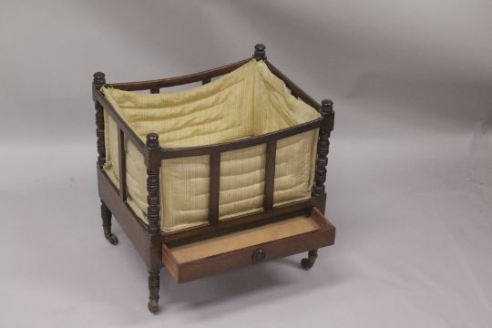 A GEORGIAN MAHOGANY CANTERBURY with turned supports, slatted sides and single drawer supported on brass casters.