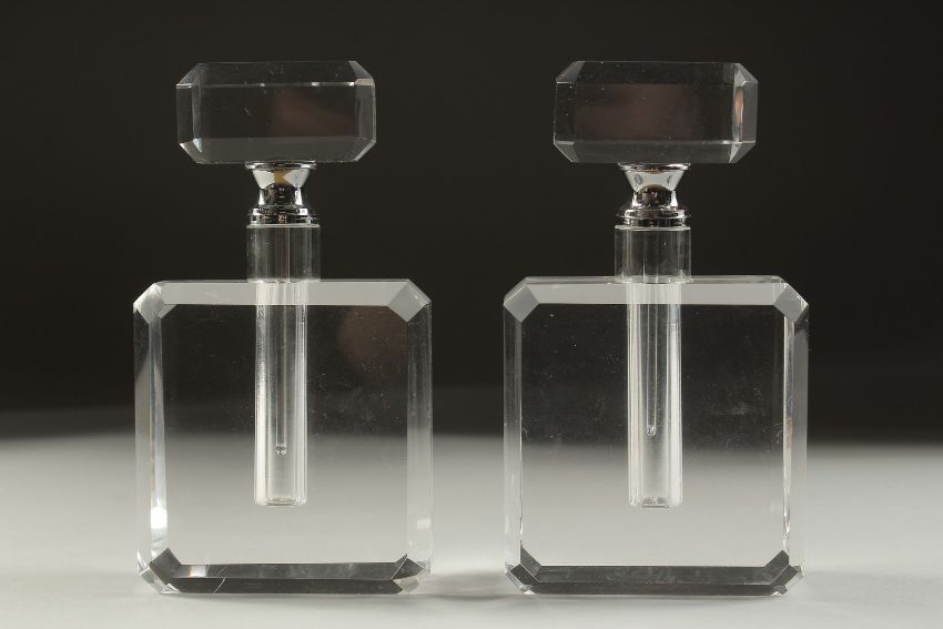 A PAIR OF ART DECO STYLE CLEAR GLASS SCENT BOTTLES.