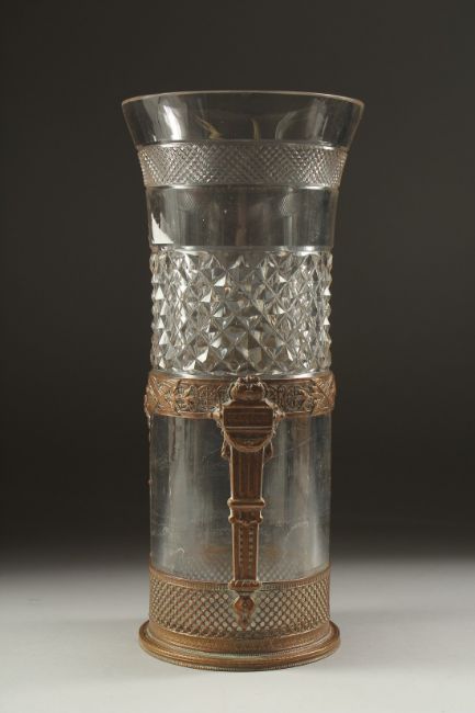 AN 19TH CENTURY FRENCH BRASS AND GLASS VASE.