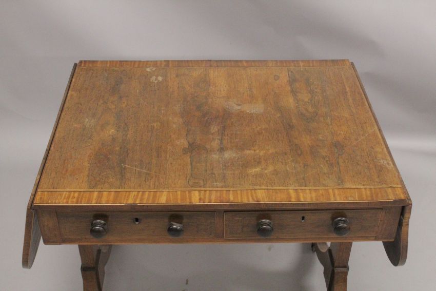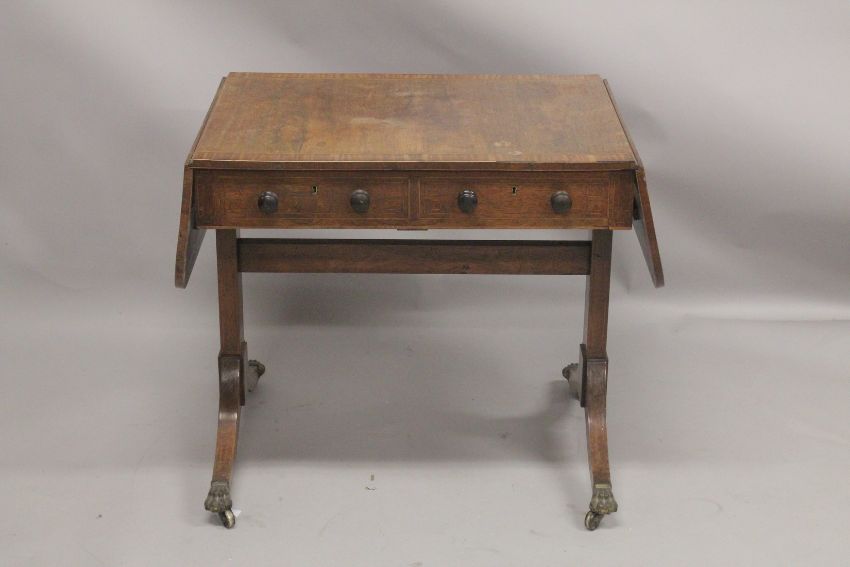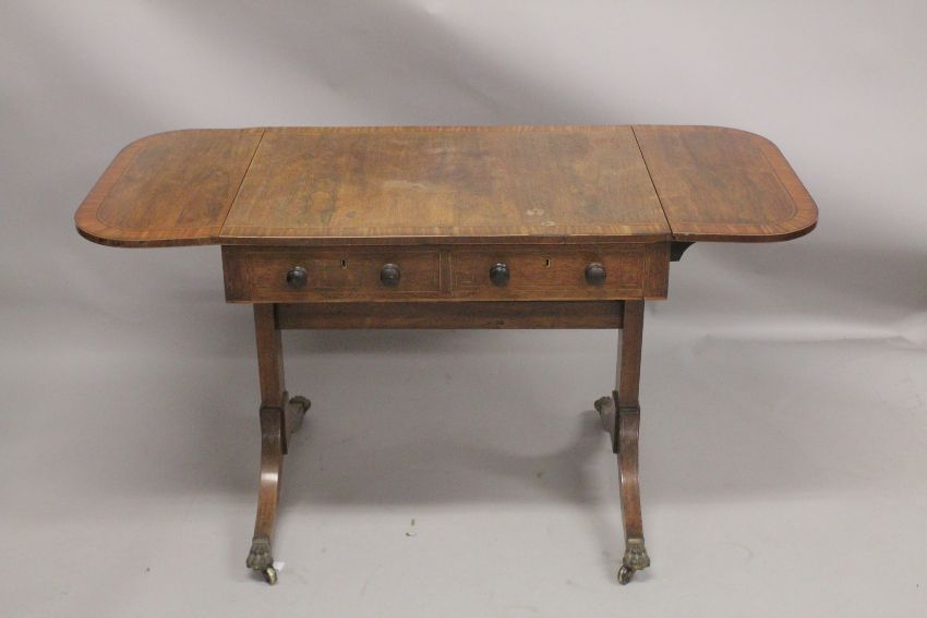 A REGENCY ROSEWOOD SOFA TABLE with folding flaps, on curving legs with casters.