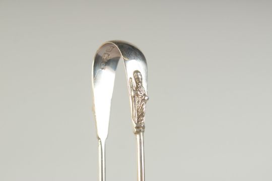 A SET OF SIX SILVER APOSTLE TEA SPOONS AND SILVER TONGS, cased.