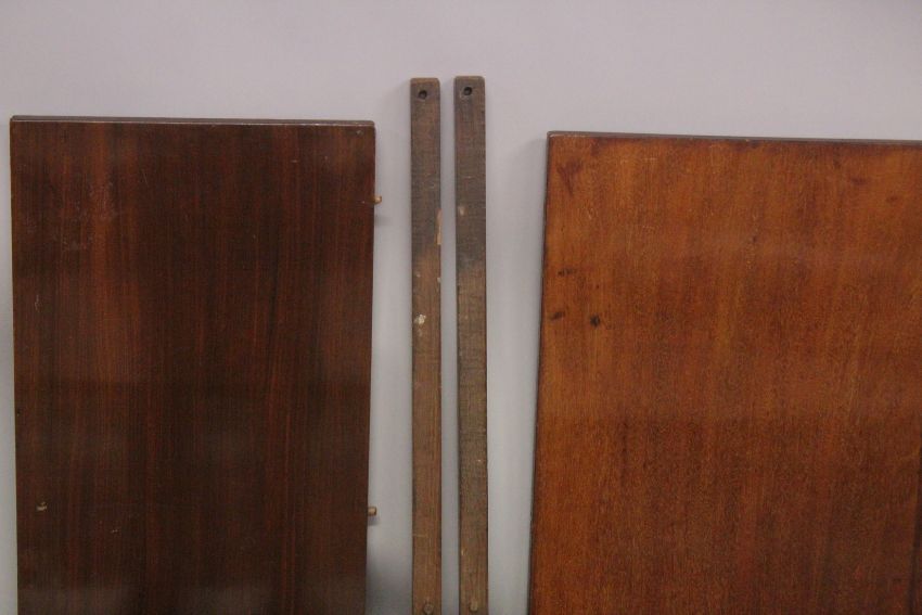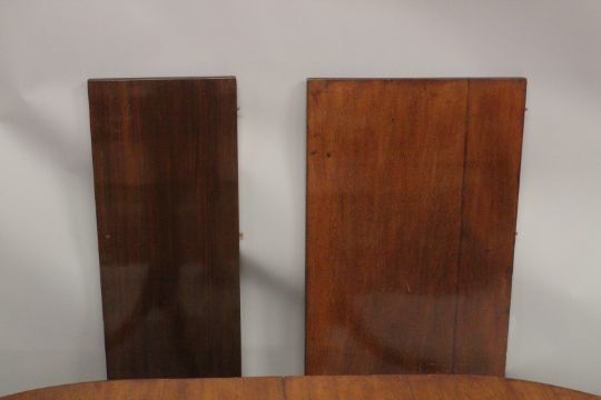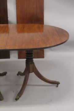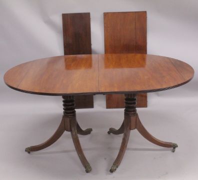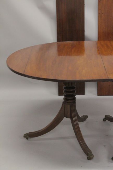 A GEORGIAN MAHOGANY 'D' END DOUBLE PILLAR DINING TABLE with two loose leaves, plain top, reeded edge, turned pillar support and tripod curving legs with brass casters.