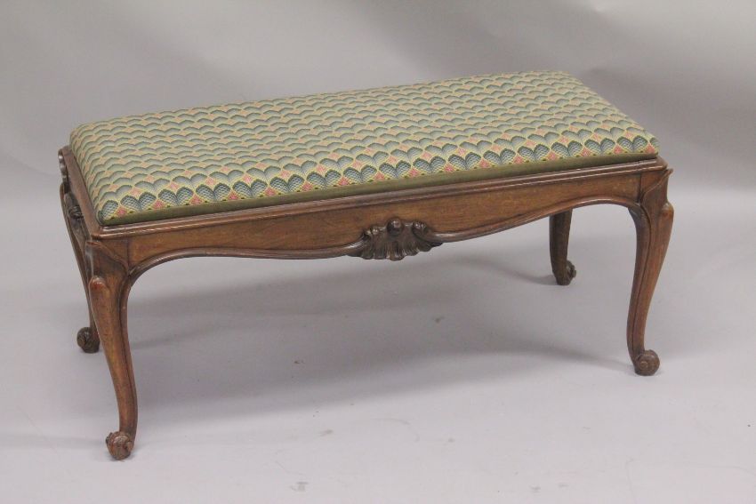 A VICTORIAN ROSEWOOD LONG PADDED TOP STOOL supported on cabriole legs.
