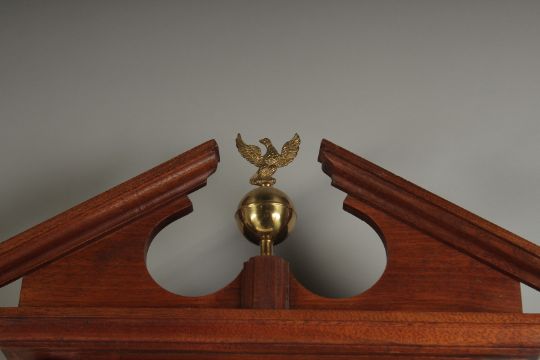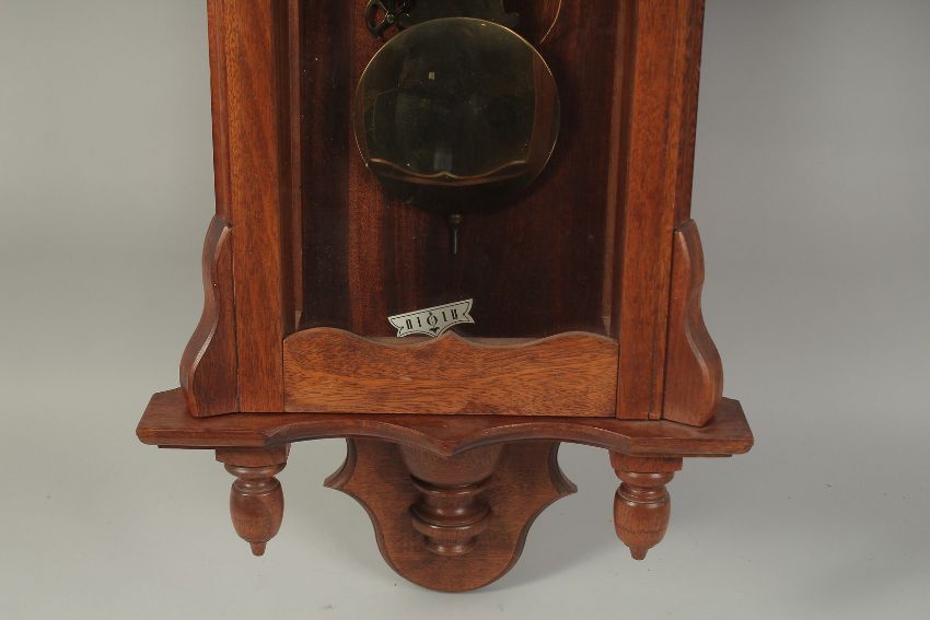 A VICTORIAN MAHOGANY HANGING WALL CLOCK with white dial, Roman numerals and brass pendulum with two weights. 44ins long.