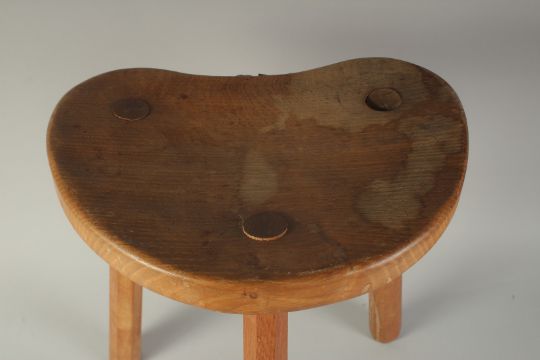 A GOOD MOUSEMAN OAK STOOL with kidney shaped top, on three legs.