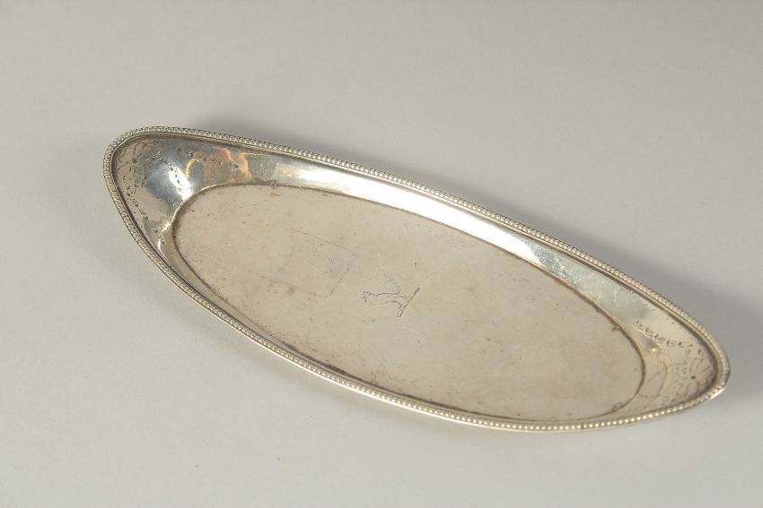 A GEORGE III OVAL SILVER SNUFFER TRAY with bead edge, bird crest.