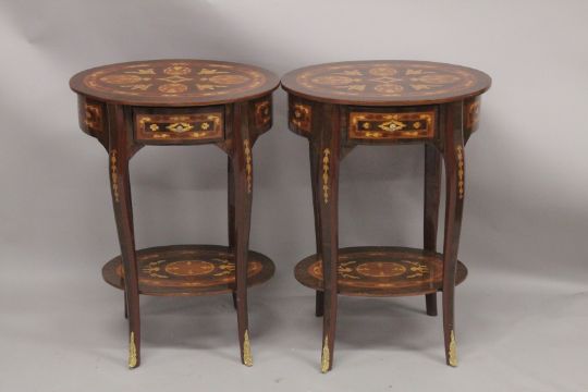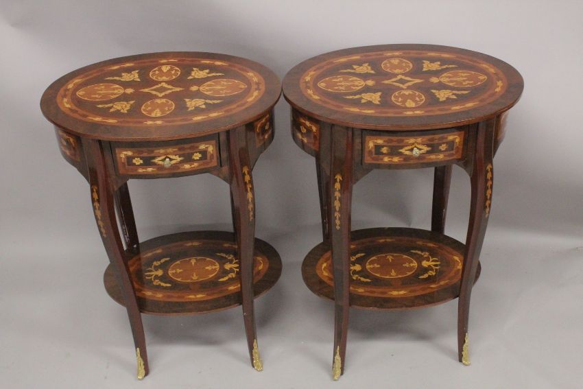 A GOOD PAIR OF LOUIS XVITH DESIGN OVAL BEDSIDE TABLES with single drawer, curving legs and undertier.