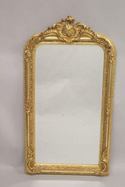 A GOOD LARGE GILTWOOD UPRIGHT MIRROR with acanthus and scrolls.
