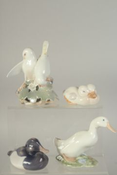 FOUR SMALL COPENHAGEN PORCELAIN BIRDS: DOVES, No. 702, TWO DUCKS NO. 516, GOOSE, No. 1192 & TEAL, No. 1924 (4).