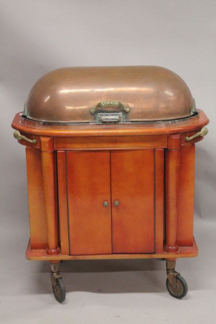 A GOOD HOTEL METAL TROLLEY with rising folding copper cover, fitted interior over a pair of panel doors on castors.