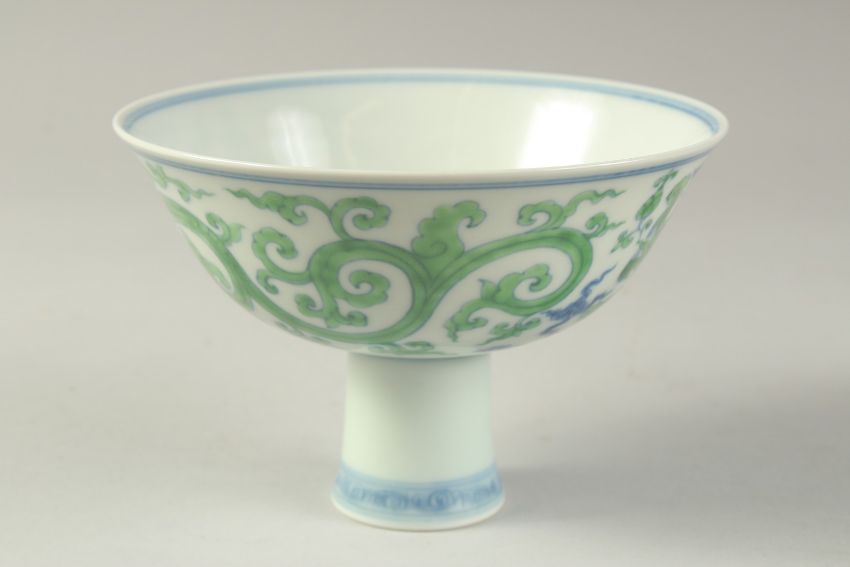 A CHINESE FAMILLE VERTE PORCELAIN STEM CUP with kui dragons. 15.5cm diameter.
