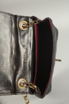A SMALL CHANEL PADDED BLACK LEATHER HAND BAG, 7ins with long gilt handle.