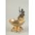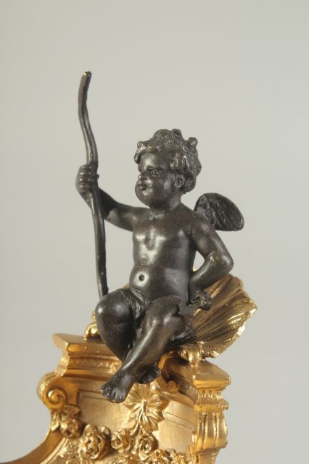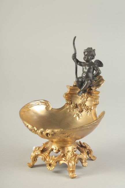 A BRONZE AND GILT BRONZE TABLE SALT modelled as a cherub, seated on a shell shaped dish.
