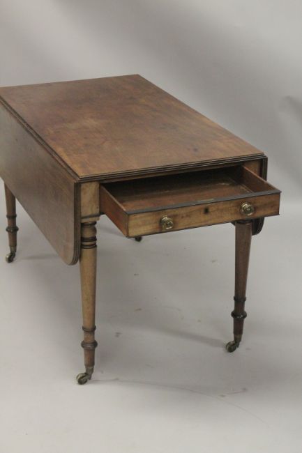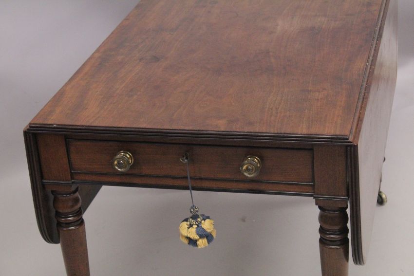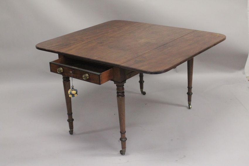A LARGE 19TH CENTURY GILLOW MODEL MAHOGNAY PEMBROKE TABLE with reeded edge, folding flaps and drawer, each end, with brass handles, supported on turned feet with brass casters.