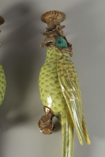 A PAIR OF PORCELAIN AND ORMOLU WALL MOUNTED CANDLESTICKS modelled as parrots.