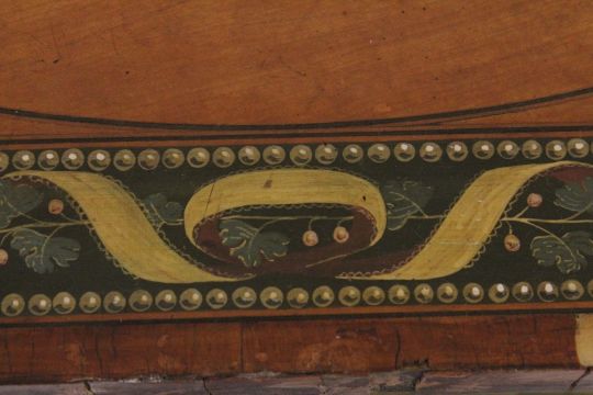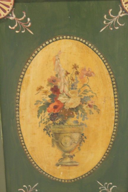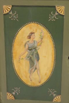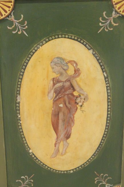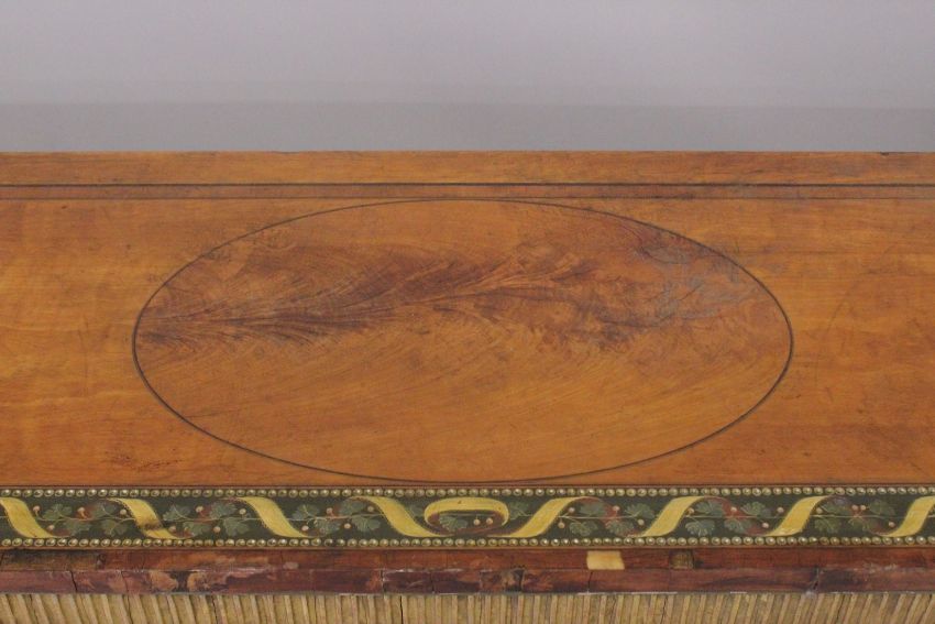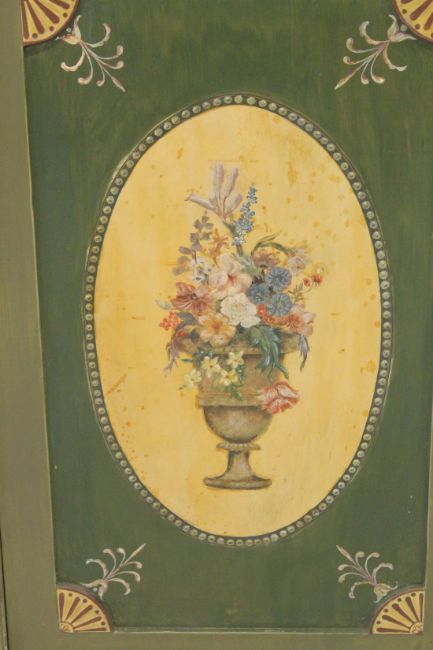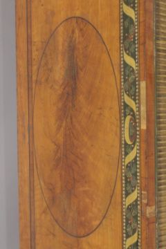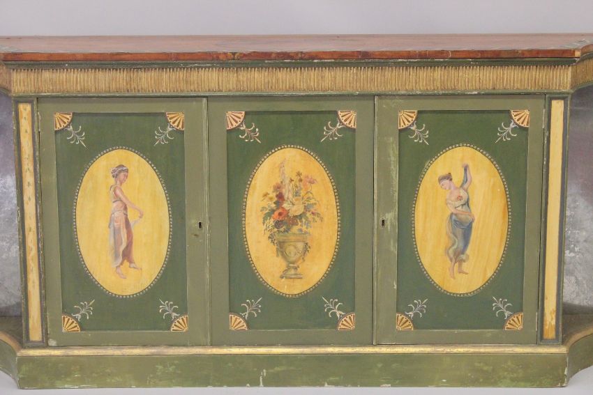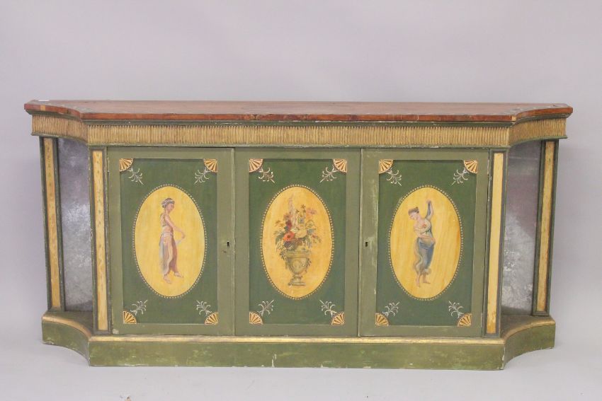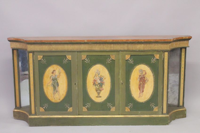 A VERY GOOD PAIR OF PAINTED SHERATON SIDE CABINETS, FAUX SATINWOOD, painted with garlands, the front with central panel door flanked by cupboard doors painted with urn and flowers and classical figures, open ends with glass panels supported on a platform base.