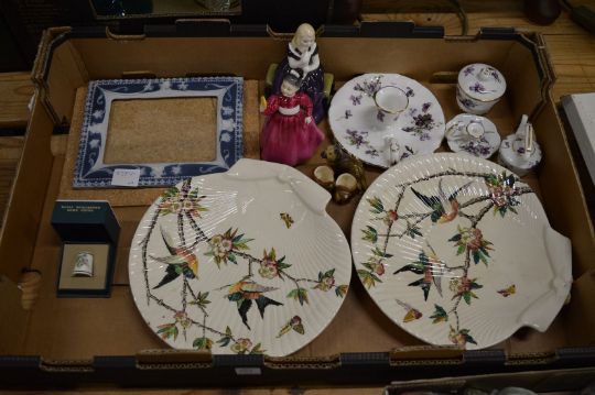 A pair of shell shaped cream ware dishes, Doulton figures etc.