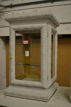 Decoratively painted table top display cabinet.