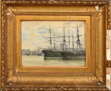 Jules Lessore (1849-1892) French, 'Port de Rouen' tall ships moored in a city quay, watercolour, signed, 9.5" x 13" (24 x 33cm).