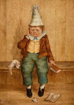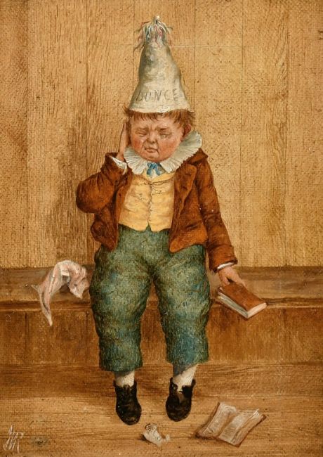 19th Century English School, A pair of humorous oil on canvas paintings of children, each indistinctly signed with initials, each 8" x 6" (20 x 15cm).