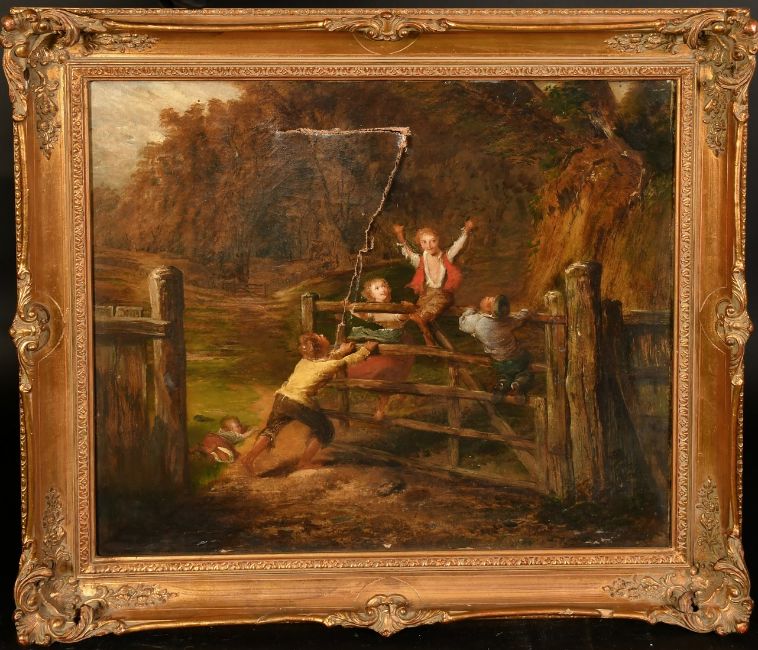 19th Century English School, children playing on a swinging gate, oil on canvas, 20" x 24" (51 x 61cm), a/f note with large tear.