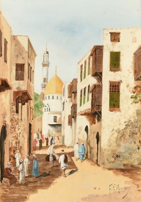 F. E. Martinez (Circa 1900), a pair of watercolour scenes of North African figures amongst city buildings, signed, each 13" x 9" (33 x 22cm), (2).