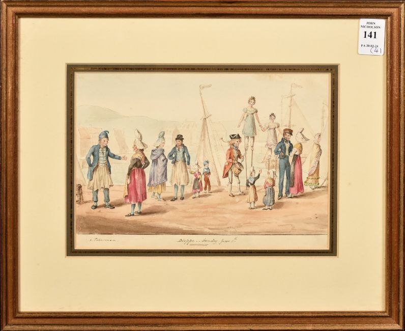 English School, Circa 1821, scenes of everyday life in Paris society and one of Dieppe, watercolour, inscribed, each 6" x 8.5" (15 x 21.5cm), (4).