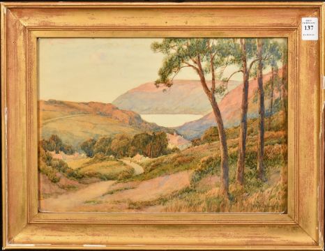 John Fullwood (1854-1931), cottages in a valley with a view of a bay beyond, watercolour, signed, 10" x 14" (25 x 35cm).