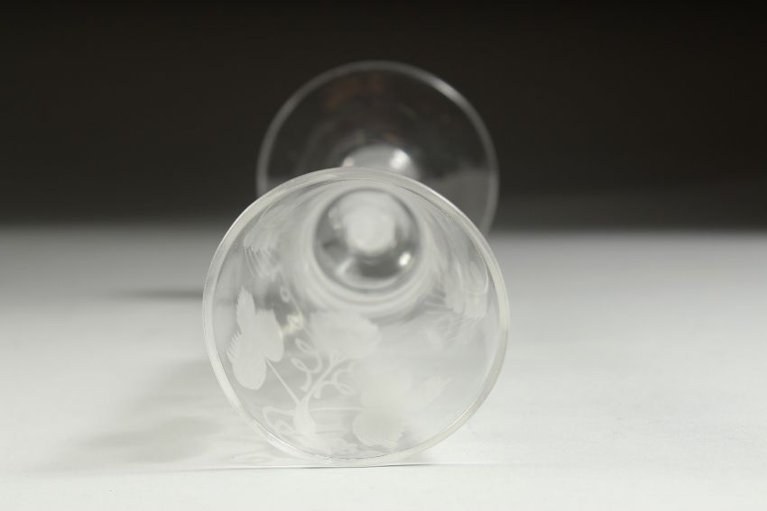 A GEORGIAN WINE GLASS with white air twist stem, long flute engraved with hops.