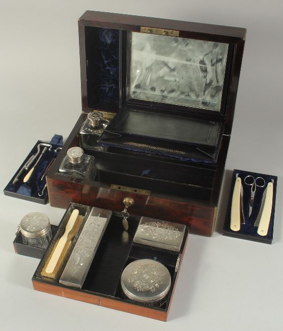 A VERY GOOD VICTORIAN LADIES ROSEWOOD DRESSING CASE with brass banding opening to reveal five silver top glass bottles. London 1852. Maker W. Y. Also with a pair of boot hooks, razor and scissors. 12.5ins long x 8ins wide x 5ins deep.