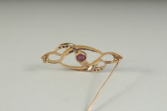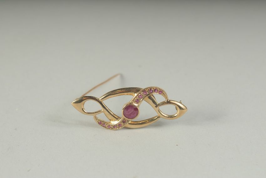 A 9CT GOLD RUBY SET BROOCH, boxed.