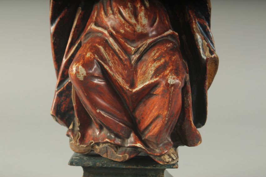 A GOOD 17TH - 18TH CENTURY CARVED WOOD AND PAINTED PRAYING FIGURE on a plinth.