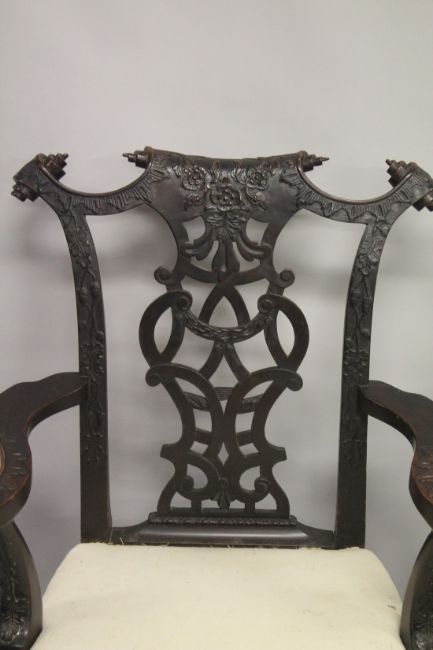 A VERY GOOD PAIR OF IRISH CHIPPENDALE MAHOGANY ARMCHAIRS CIRCA 1860, carved with oak leaves and acorns, flowers and scrolls with interlaced splats, curving arms, padded seats and supported on cabriole legs ending in claw and ball feet.