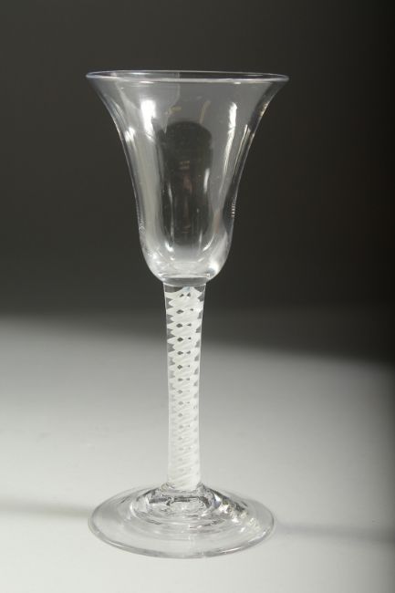 A GEORGIAN WINE GLASS with inverted bell bowl and white twist stem.