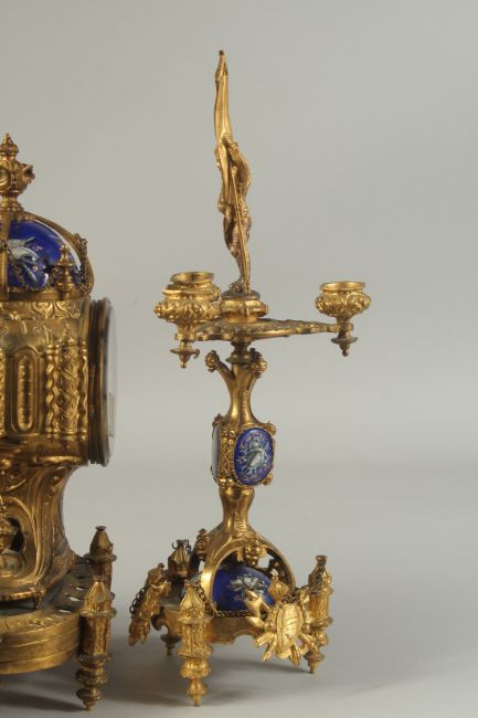 A VERY GOOD 19TH CENTURY FRENCH GILT METAL AND BLUE ENAMEL THREE PIECE CLOCK GARNITURE, the clock with enamel face and vignettes. 12ins high along with a pair of four light candlesticks., 16ins high.